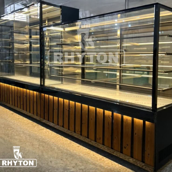 طراحی ویترینی شفاف با نورپردازی LED، مناسب برای نمایش شیرینیها و دسرهای وسوسهانگیز در قنادیهای لوکس.